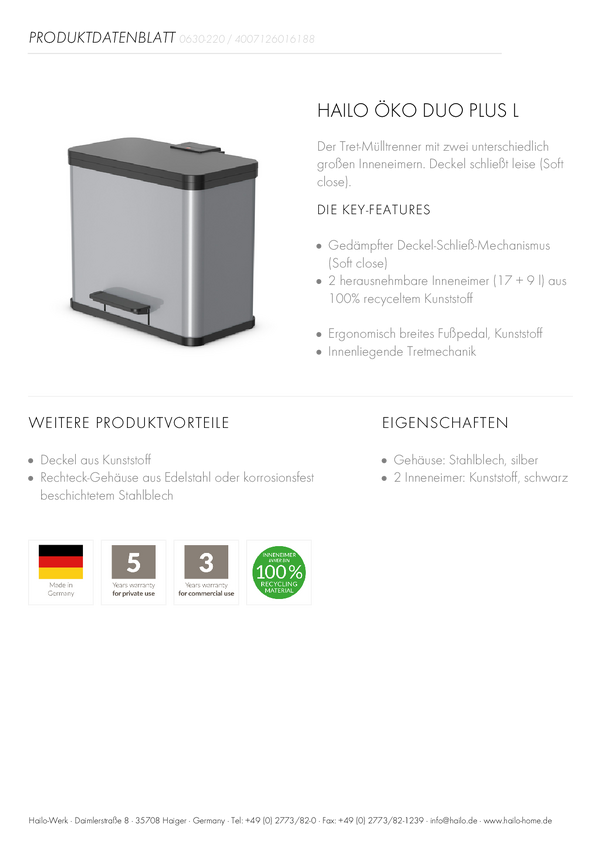 Hailo öko duo plus L 6302200 Kosz na śmieci 26 l blacha stalowa (S x W x G) 470 x 430 x 340 mm jasnoszary Mechanizm z pe