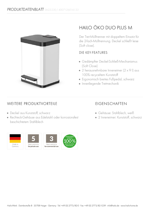 Hailo Öko duo plus M 6222300 Kosz na śmieci 18 l blacha stalowa (D x S x W) 33 cm x 320 mm x 430 mm biały Mechanizm z pe