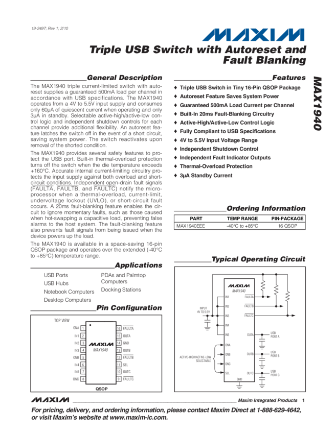 MAX1940 Triple USB Switch with Auto-Reset and Fault Blanking