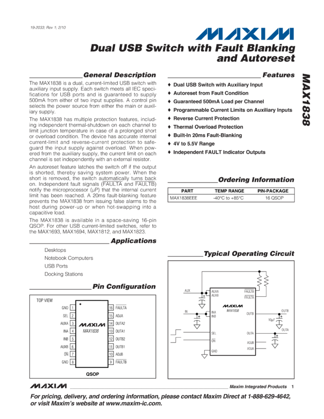 MAX1838 Dual USB Switch with Fault Blanking and Autoreset