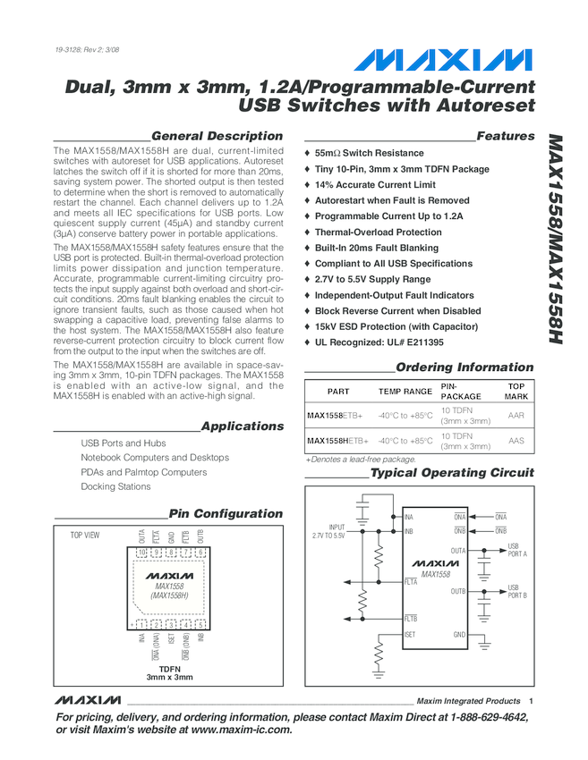 MAX1558H Dual USB Switch with Fault Blanking and Auto-Reset