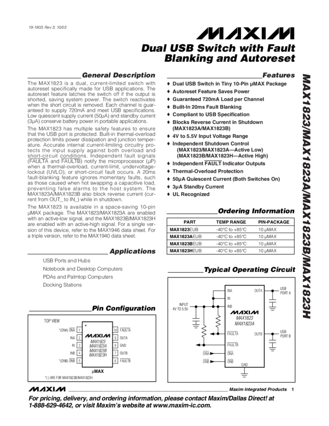 MAX1823B Dual USB Switch with Fault Blanking and Auto-Reset