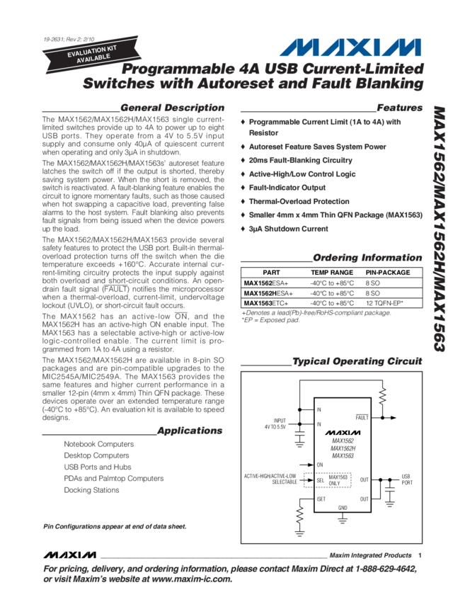 MAX1563 Programmable 4A USB Current-Limited Switches with Auto-Reset and Fault Blanking