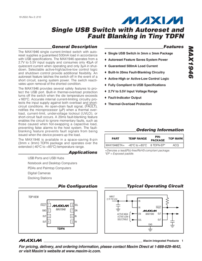 Single USB Switch with Autoreset and Fault Blanking in Tiny TDFN