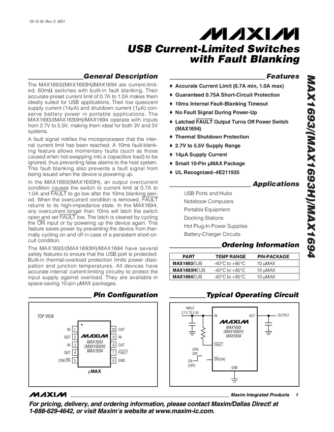 MAX1607 USB Current-Limited Switch w/ Fault Blanking and Pin-Compatible Package