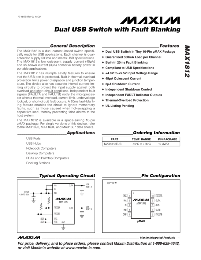 MAX1812 Dual USB Switch with Fault Blanking