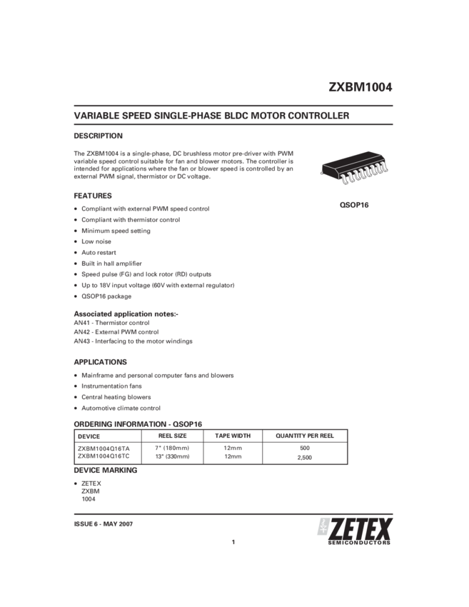 MTD6502B 5V 3-Phase BLDC Sinusoidal Sensorless Fan Motor Driver Data Sheet (05/19/2011)
