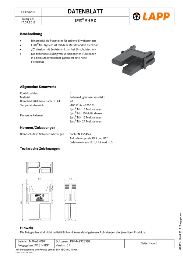 EPIC® MH 0 Blind moduł z centrowaniem 44423233 LAPP 10 szt.