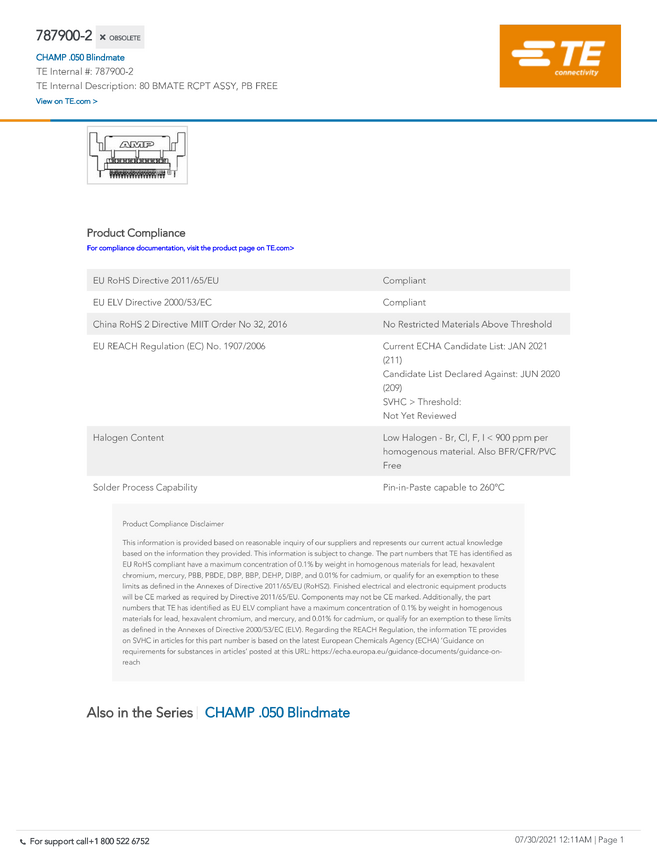 TE Connectivity 787900-2 TE AMP CHAMP .050 Blindmate, 1 szt.