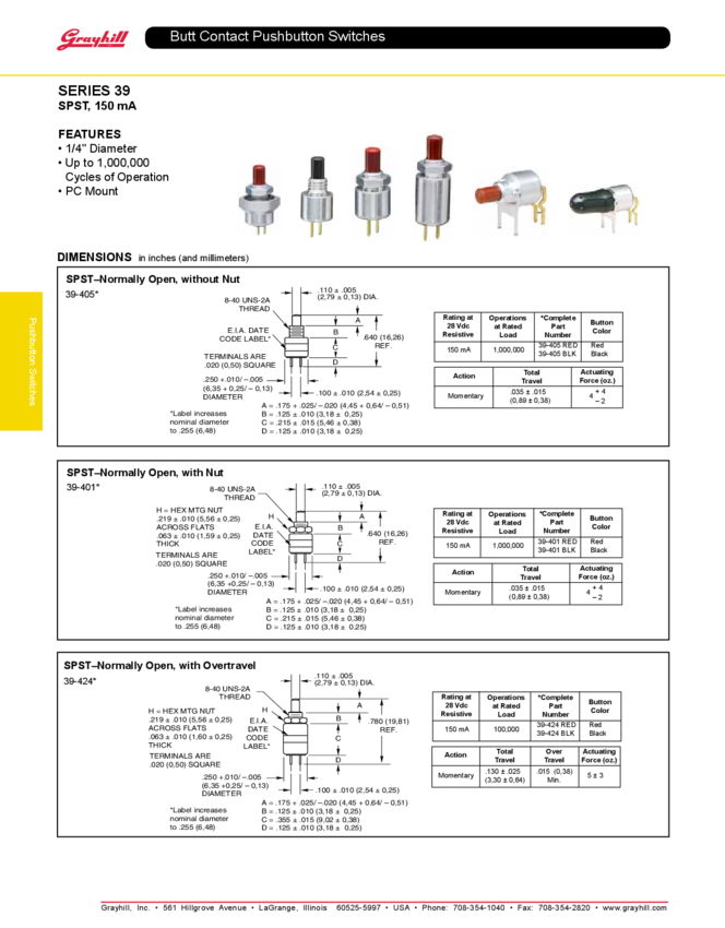 Switch Push Button N.O. SPST Round Plunger 0.15A 28VDC Momentary Contact PC Pins Thru-Hole