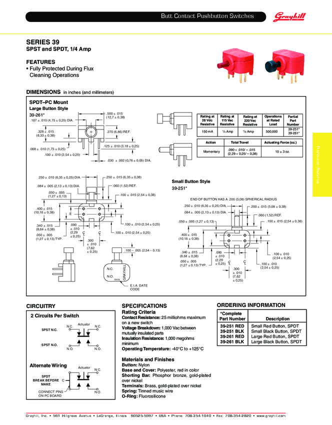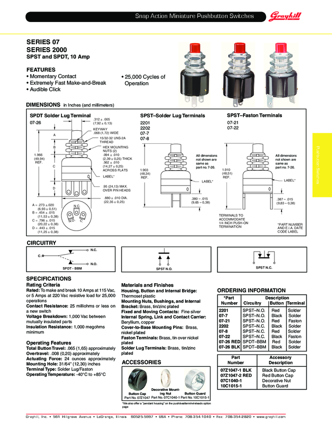 Switch Push Button N.O./N.C. SPDT Round Plunger 0.25A 220VAC 28VDC Momentary Contact PC Pins Thru-Hole