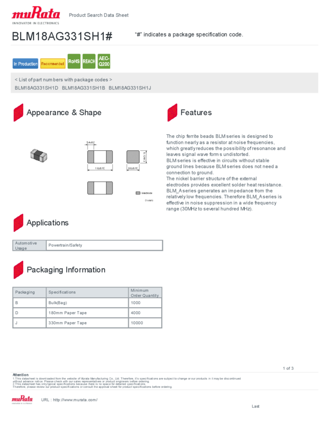 Ind Chip Bead Multi-Layer 330Ohm 25% 100MHz Ferrite 1.7A 0603 Paper T/R
