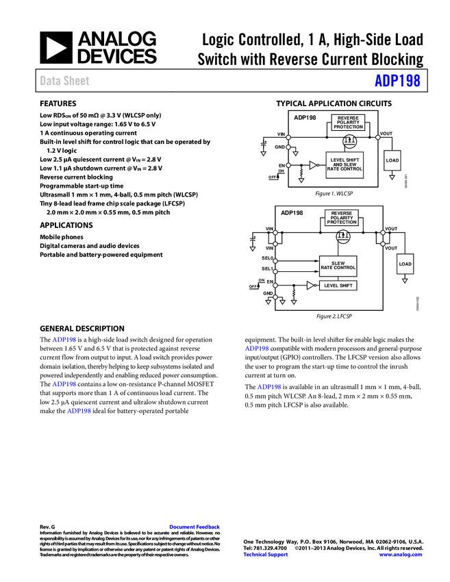 ADP198: Logic-Controlled, 1 A, High-Side Load Switch with Reverse Current Blocking