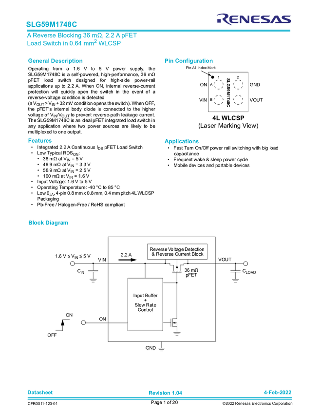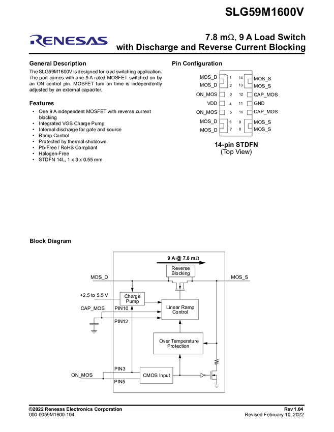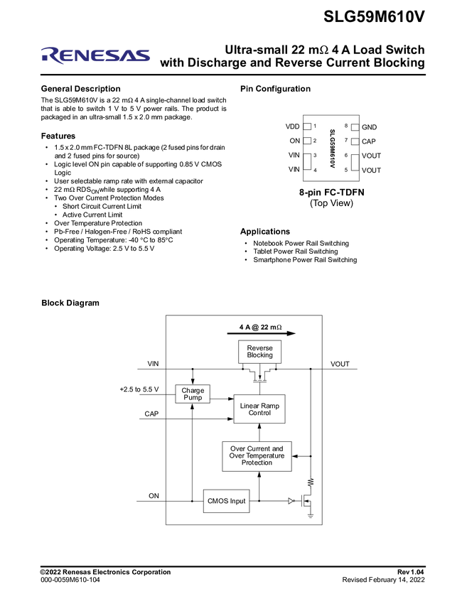 Logic-Controlled, 1 A, High-Side Load Switch with Reverse Current Blocking