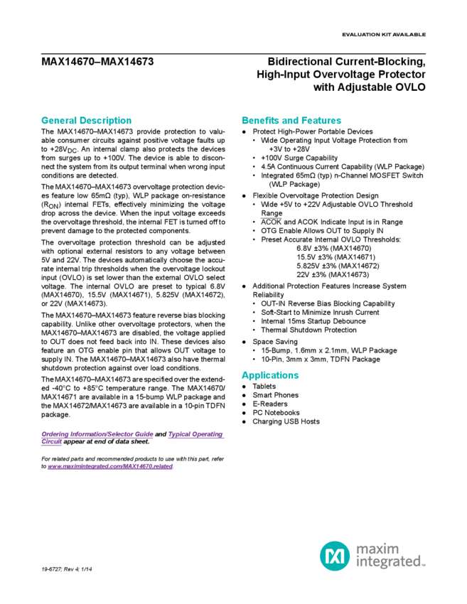 MAX14670, MAX14671, MAX14672, MAX14673 Bidirectional Current-Blocking, High-Input Overvoltage Protectors with Adjustable OVLO