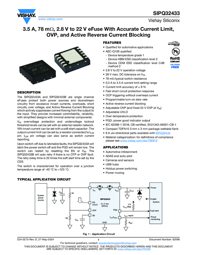 3.5 A, 78 mΩ, 2.8 V to 22 V True Reverse Current Blocking eFuse With Programmable Current Limit and OVP Switch