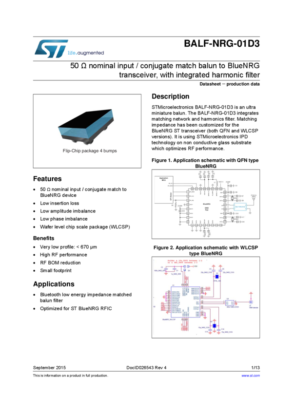 50Ω nominal input / conjugate match balun to BlueNRG transceiver, with integrated harmonic filter