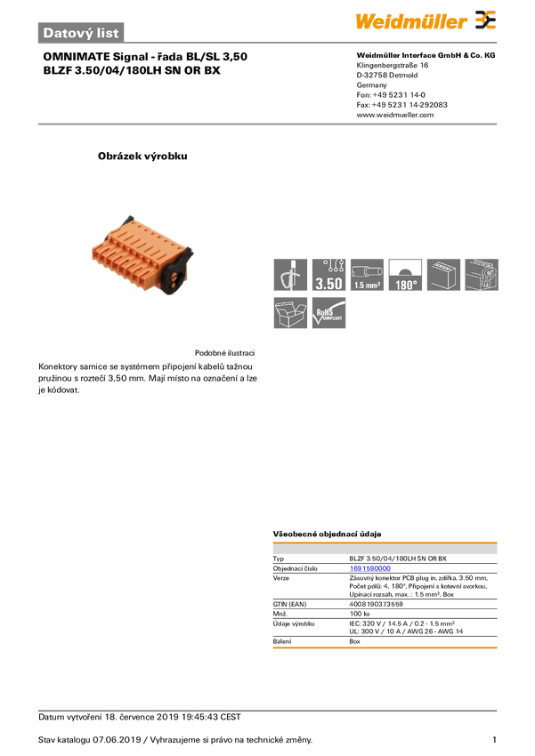 Weidmüller 1691590000 Obudowa złącza pin żeńskiego na kabel BLZF 3.50/04/180LH SN OR BX, wire-to-board, piny: 4, 10 A, 1
