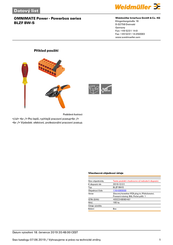 Złącze wtykowe do druku, Akcesoria, narzędzie do naciskania, biały, Liczba biegunów: 1 BLZF BW-S 1764080000 Weidmüller Z