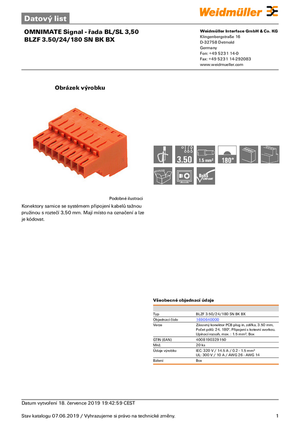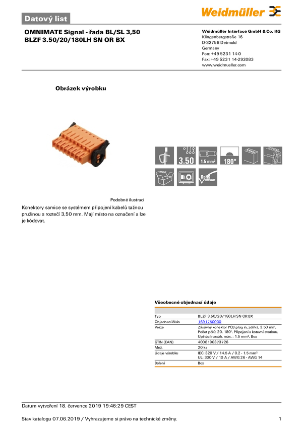 Weidmüller 1691750000 Obudowa złącza pin żeńskiego na kabel BLZF 3.50/20/180LH SN OR BX, wire-to-board, piny: 20, 10 A,