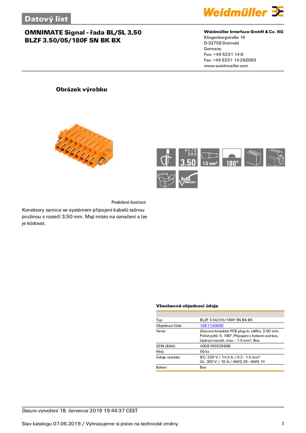 Weidmüller 1691610000 Obudowa złącza pin żeńskiego na kabel BLZF 3.50/06/180LH SN OR BX, wire-to-board, piny: 6, 10 A, 5