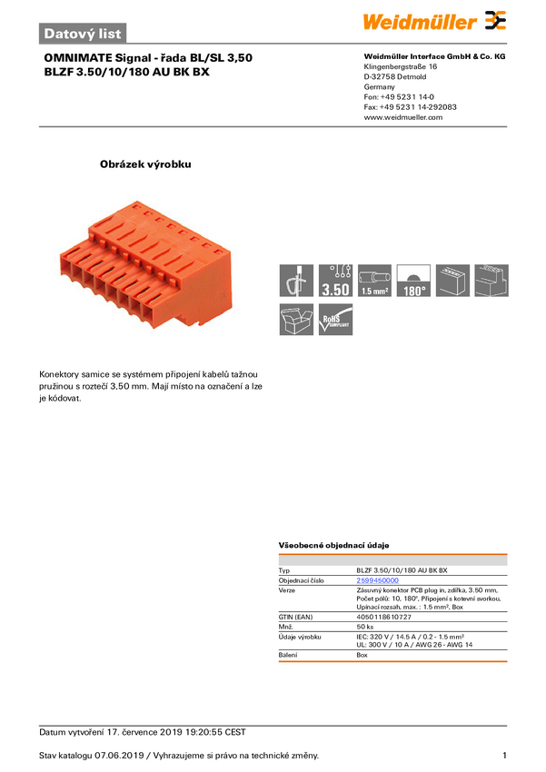 Weidmüller 2599450000 Obudowa złącza pin żeńskiego na kabel BLZF 3.50/10/180 AU BK BX, 500 szt.