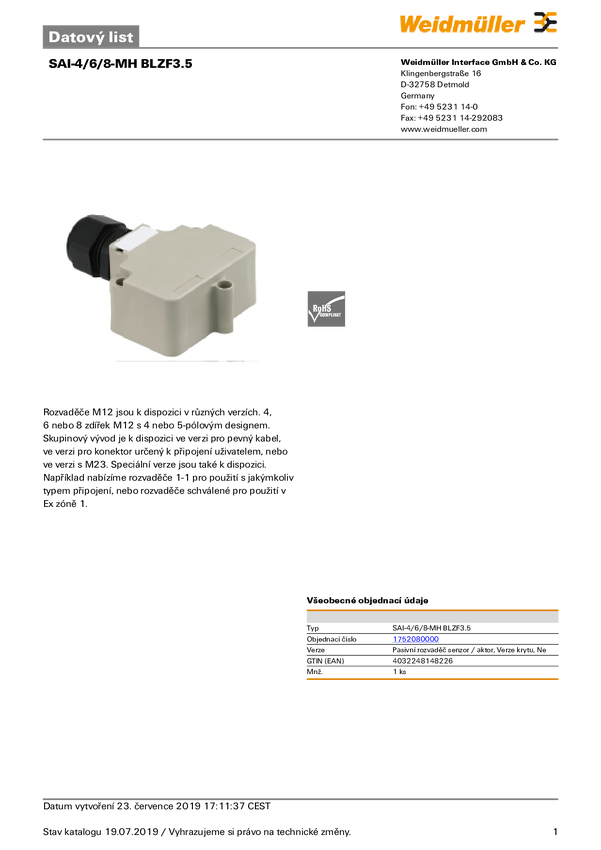 Rozdzielacz czujnik / element wykonawczy, pasywny Weidmüller SAI-4/6/8-MH BLZF3.5 1752080000 1 szt.