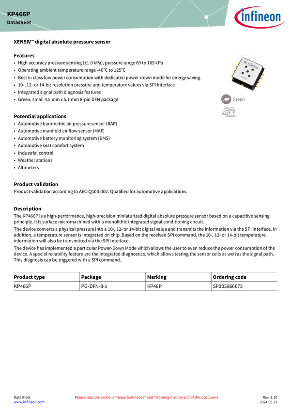 XENSIV™ - KP466P BMS satellite air pressure sensor to detect thermal runaway events in eVehicles The latest member of the KP46x digital air pressure sensor family is dedicated for the detection of the pressure rise inside the battery pack due a failing battery cell. Highly accurate, highly sensitive and reliable features make the sensor the ideal fit for advanced automotive, but also for industrial and consumer use cases.