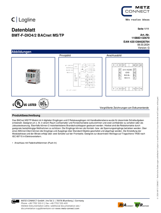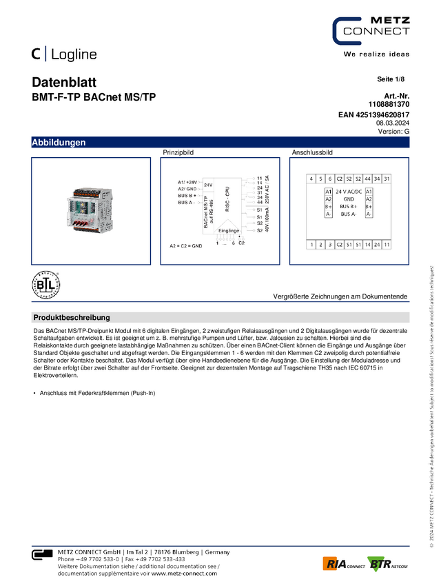 Metz Connect BMT-F-TP BACnet MS/TP 1108881370 24 V/AC, 24 V/DC 100 mA Ilość wyjść:4 x