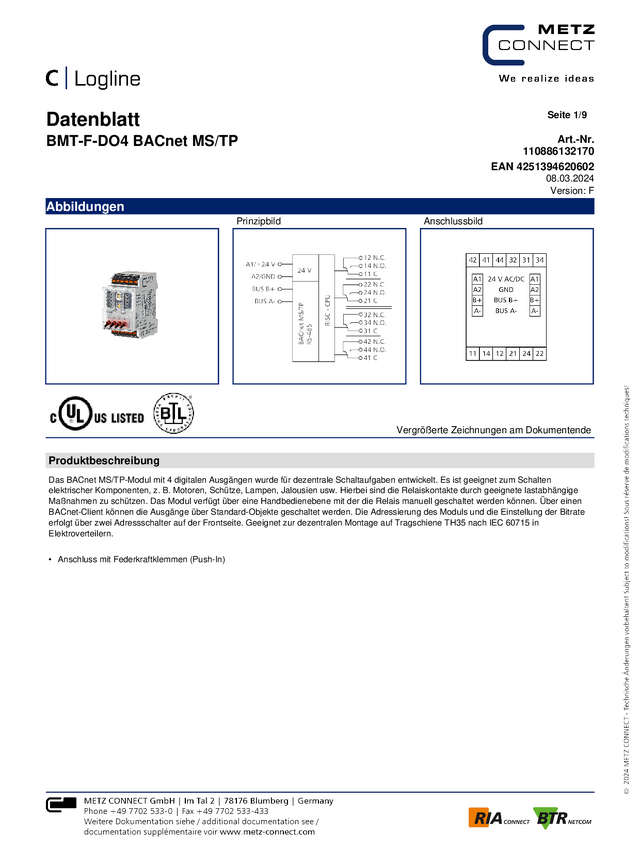 Metz Connect BMT-F-DO4 BACnet MS/TP 110886132170 24 V/AC, 24 V/DC 200 mA Ilość wyjść:4 x