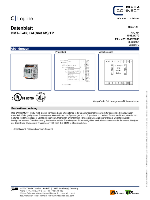 Metz Connect BMT-F-AI8 BACnet MS/TP 1108821370 24 V/AC, 24 V/DC 65 mA