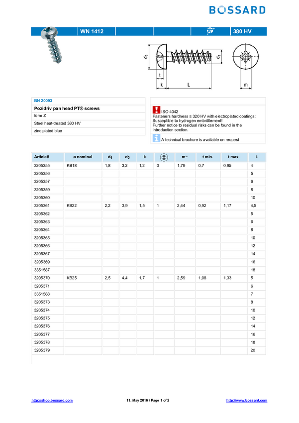 Wkręt; do tworzyw; M3x6; Łeb: walcowy; Pozidriv; stal; BN: 20093; 3205381; BOSSARD; RoHS; opakowanie/100szt