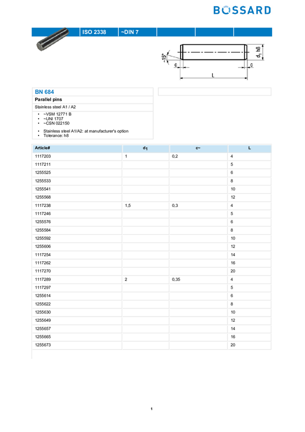 Kołek walcowy; stal nierdzewna A2; BN: 684; fi: 2mm; L: 8mm; DIN: 7; 1255622; BOSSARD; RoHS; op/100szt