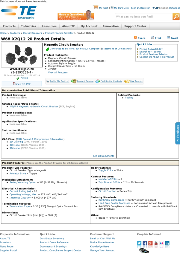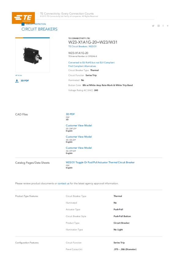 Circuit Breaker Thermal Over Current 1Pole 20A 240VAC/50VDC 2-Pin