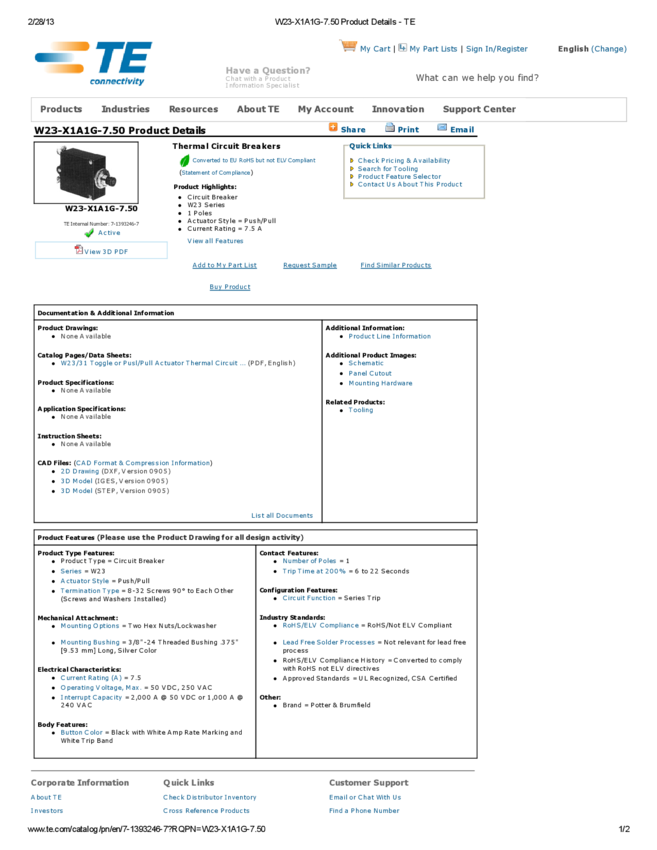 Circuit Breaker Thermal 1Pole 7.5A 240VAC/50VDC 2-Pin