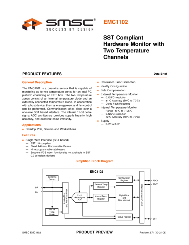 EMC1102 SST Compliant Hardware Monitor with Two Temperature Channels Data Brief