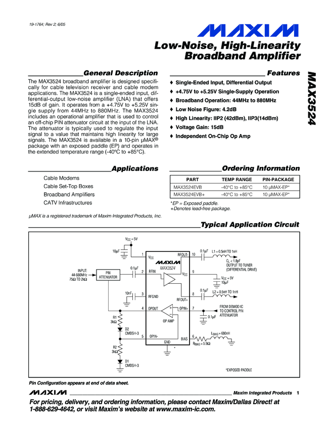 MAX3524 Low-Noise, High-Linearity Broadband Amplifier