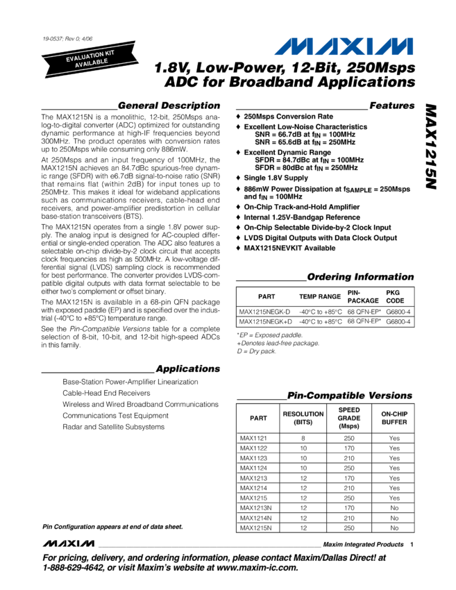 MAX1215N 1.8V, 12-Bit, 250Msps ADC for Broadband Applications