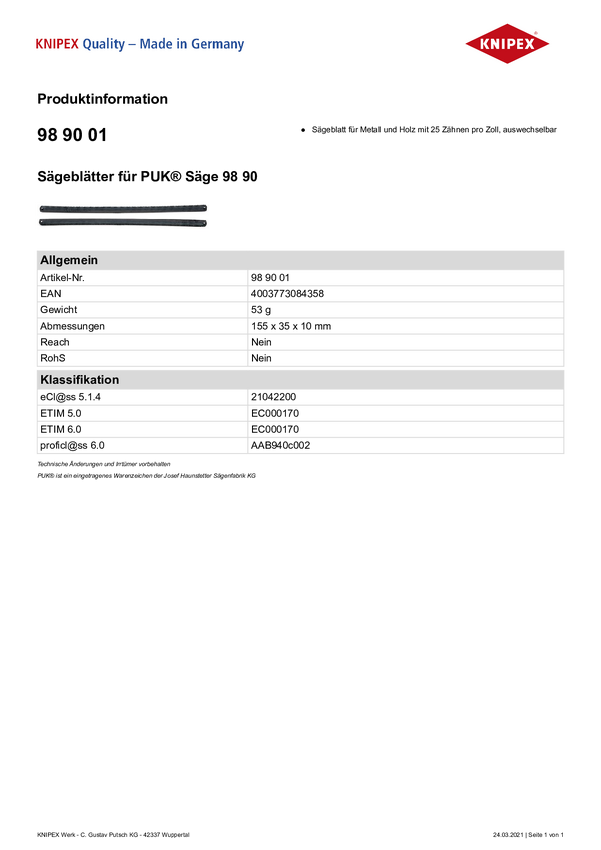 Brzeszczoty dla piły PUK® Knipex 98 90 01