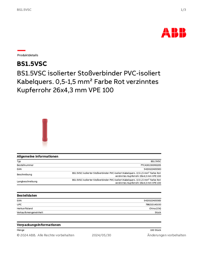 ABB 7TCA301300R0205 Złącze doczołowe BS1.5VSC, 1 szt.