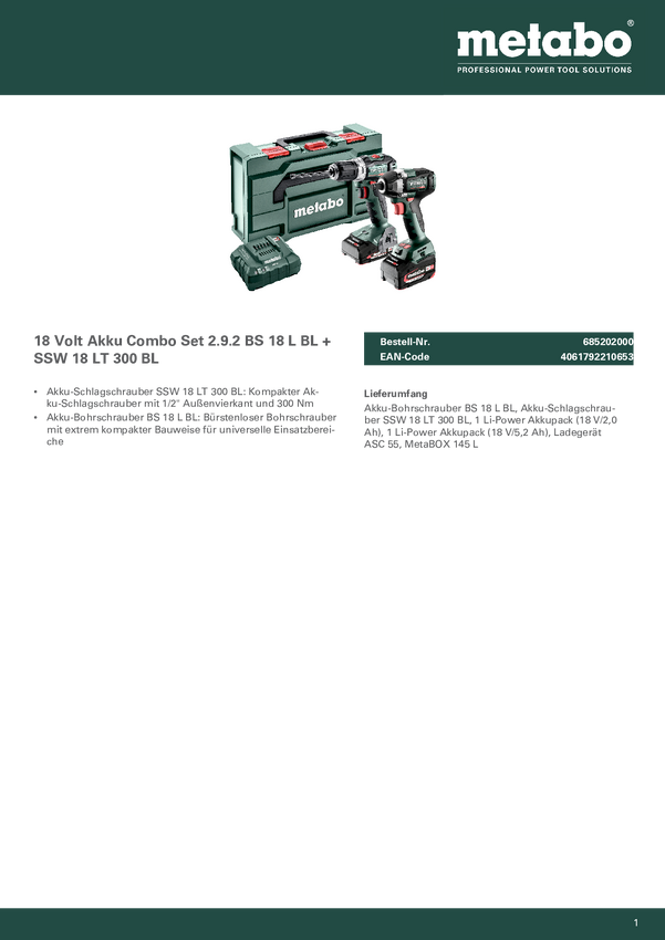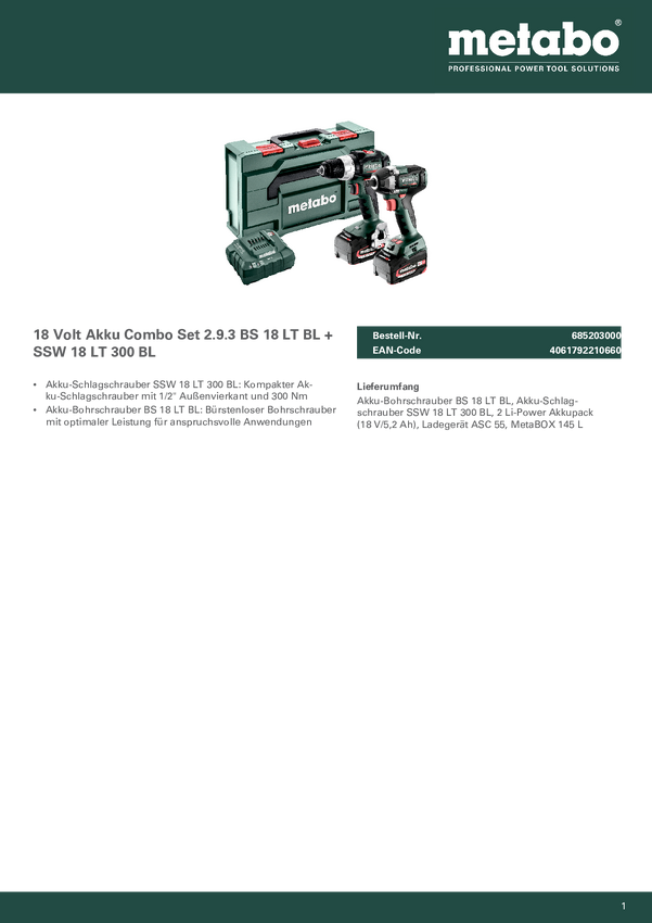 Wiertarko-wkrętarka akumulatorowa, Wkrętarka udarowa akumulatorowa Metabo BSLBL+SSWLT300BL 685203000 18 V 5.2 Ah zaw. ak
