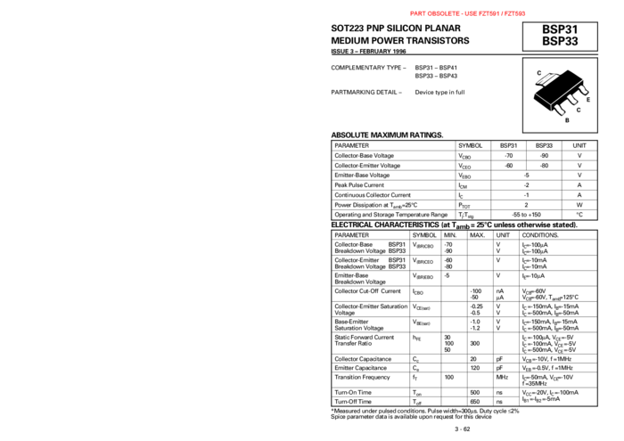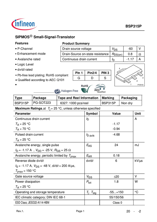 Tranzystor; BSP315P6327XTSA1; P-MOSFET; 60V; 1,17A; 1,8W; unipolarny; SOT223; BSP315; SMD; RoHS; op/100szt