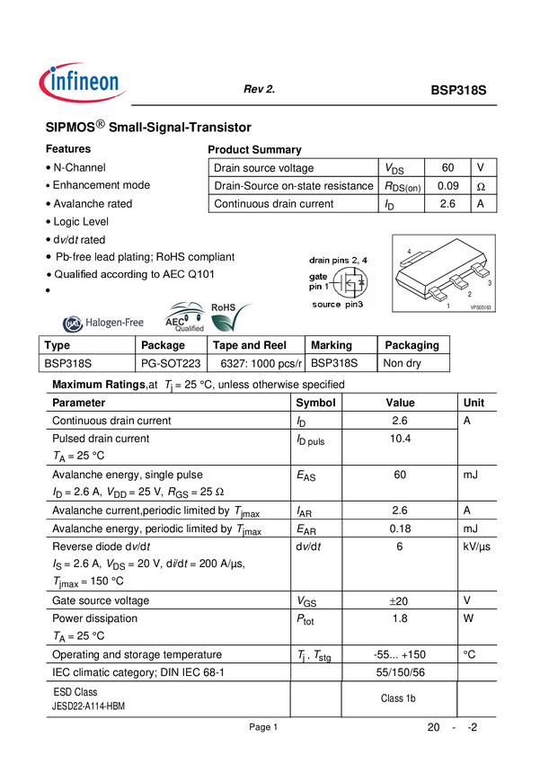 Tranzystor; BSP318S H6327; N-MOSFET; 60V; 2,6A; 1,8W; unipolarny; SOT223; SMD; Infineon; RoHS; opakowanie/100szt