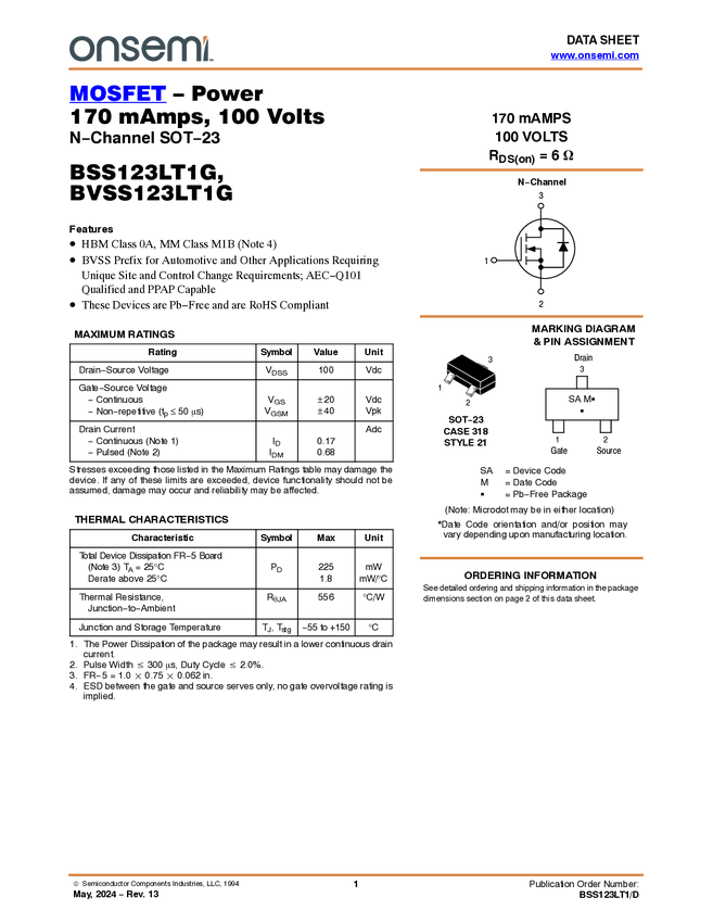 Tranzystor; BSS123; N-MOSFET; 170mA; 100V; 225mW; unipolarny; logic level; SOT23; SMD; BSS123LT1G; ON SEMICONDUCTOR; op/100szt