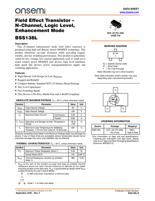 Single N-Channel Logic Level Small Signal MOSFET 50V, 200mA, 3.5Ω