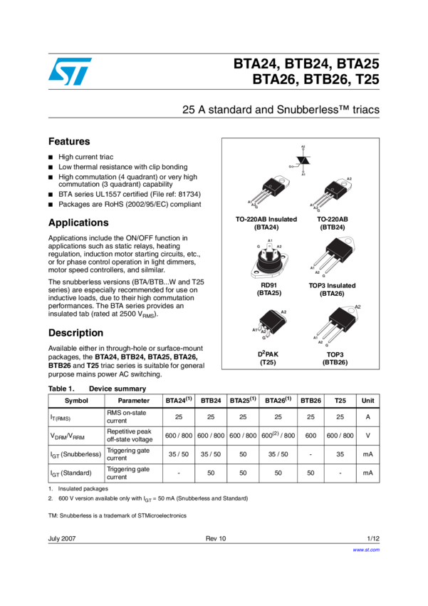 TRIAC STMicroelectronics BTA26-600BRG TOP-3 25 A 600 V