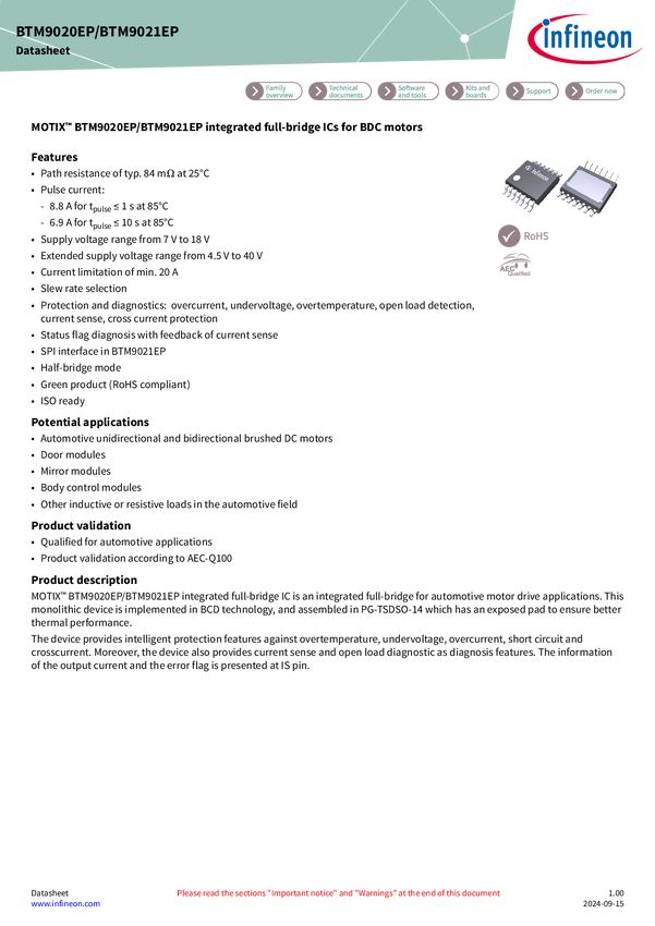 MOTIX™ BTM9021EP is a fully integrated H-bridge motor driver with SPI interface & adjustable slew rate at two levels for an improved EMC performance. The MOTIX™ BTM9021EP full-bridge IC provides a cost optimized solution for easy design in. The supply voltage of the device is at 7 V to 18 V. It suits automotive applications with limitation of minimum 20 A and covers PWM frequency of up to 20 kHz. BTM9021EP stands out due to its small (4,9 x 6,0mm) package with exposed pad leading to enhanced thermal co