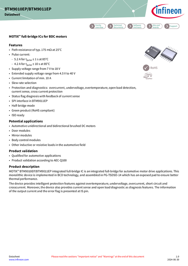 MOTIX™ BTM9011EP is a fully integrated H-bridge motor driver with SPI interface & adjustable slew rate at two levels for an improved EMC performance. The MOTIX™ BTM9011EP full-bridge IC provides a cost optimized solution for easy design in. The supply voltage of the device is at 7 V to 18 V. It suits automotive applications with limitation of minimum 10 A and covers PWM frequency of up to 20 kHz. BTM9011EP stands out due to its small (4,9 x 6,0mm) package with exposed pad leading to enhanced thermal co