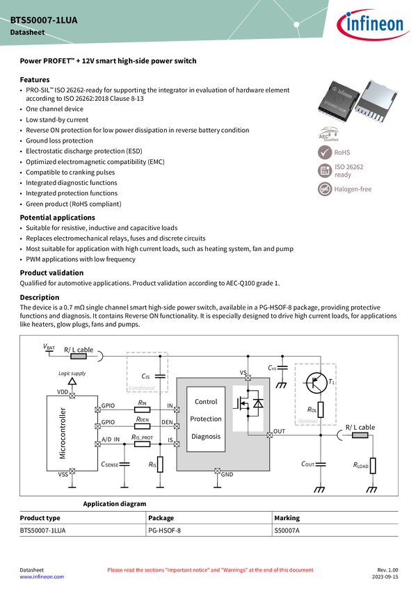 Introducing the new member of the Power PROFET™ + 12V family, the BTS50007-1LUA is a 0.7 mΩ single channel smart high-side power switch, embedded in a 8 pin TO-leadless package, providing protective functions and diagnosis. It features Reverse ON functionality protecting the device in reverse polarity condition (reverse battery). The power transistor is built by a N-channel power MOSFET with charge pump. It is especially designed to drive high current loads up to 55 A, for applications like heaters, glow pl