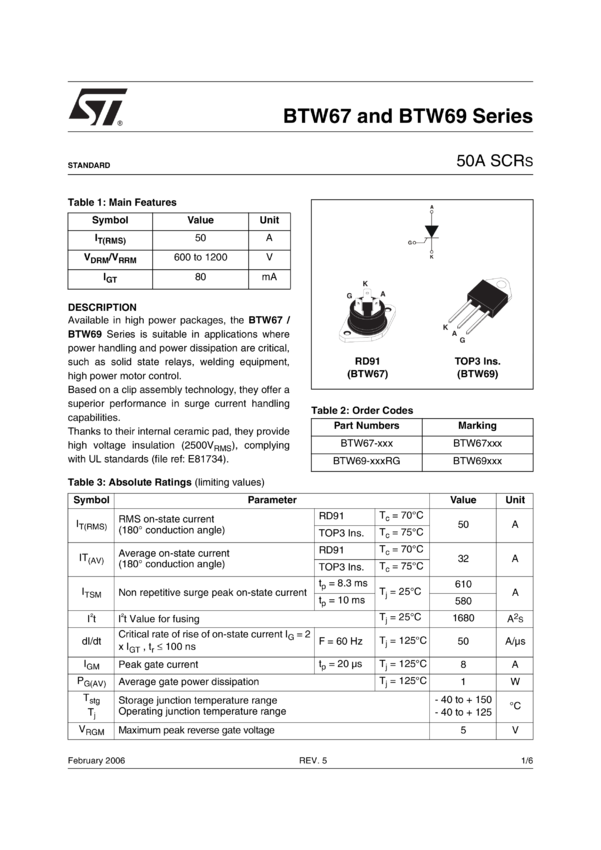 Tyrystor; BTW69-1200; 50A; 1200V; 80mA: TO3p; THT; STMicroelectronics; BTW69-1200RG; RoHS